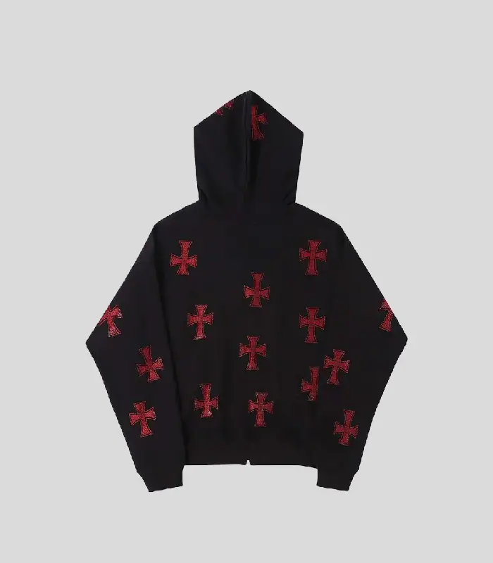 Home Hoodies Unknown : Black x Red Rhinestone Cross Zip Hoodie